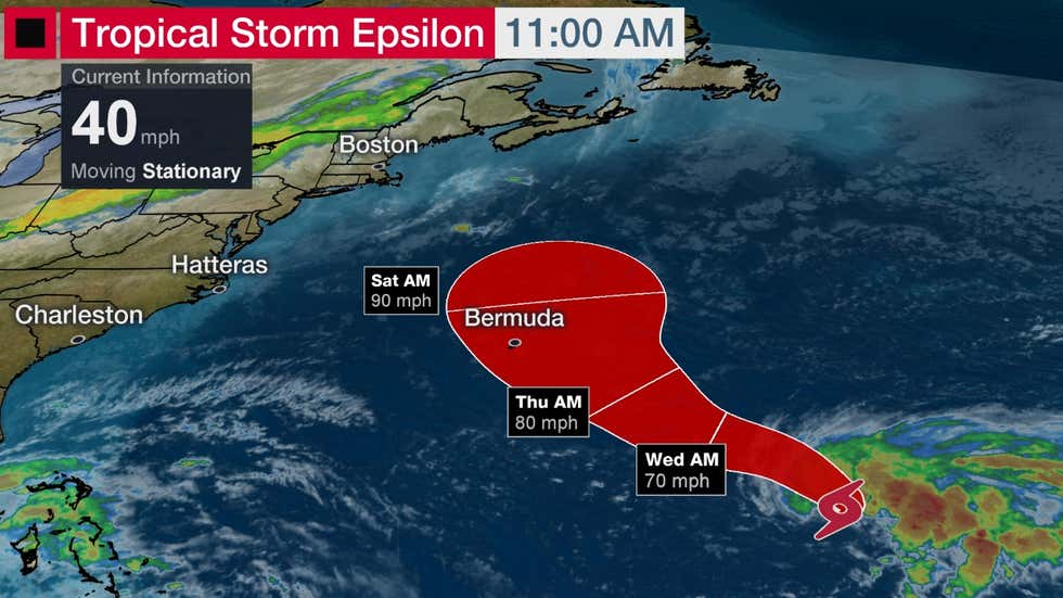 According to the Weather Channel, Tropical Storm Epsilon has formed in the central Atlantic Ocean and is expected to intensify into a hurricane before tracking close to Bermuda late this week.